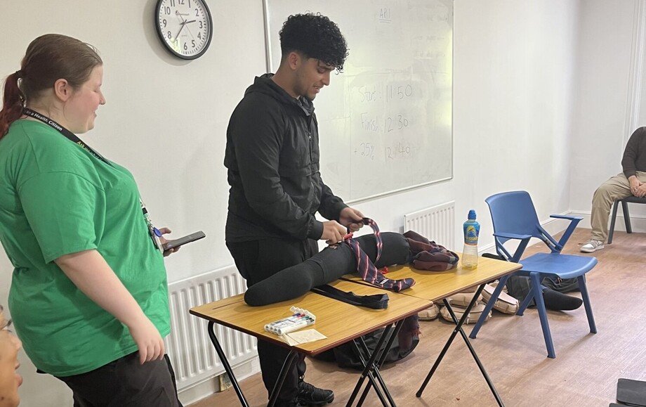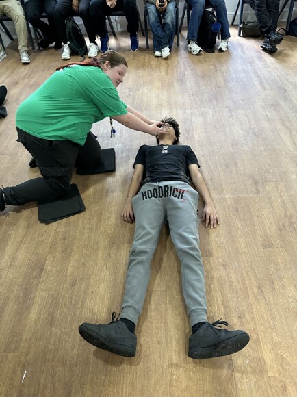 Among the highlights of the day were two Year 14 students, Zee and Musa, who bravely volunteered to demonstrate how to tie a tourniquet in front of the entire group. Their determination and poise in tackling this high-pressure task were remarkable. Musa’s performance was particularly outstanding, as he achieved the quickest tourniquet application time for the West Midlands region!